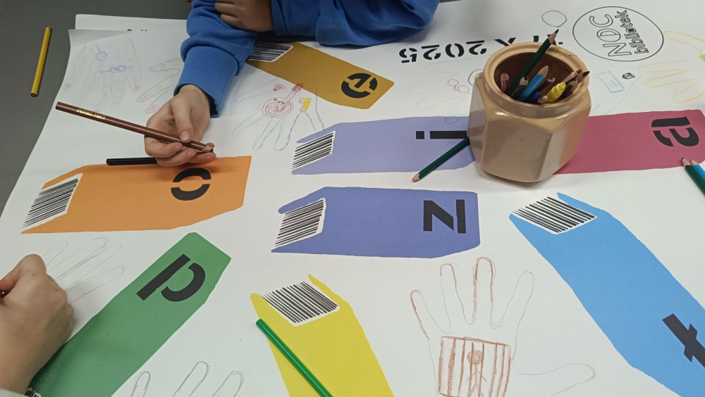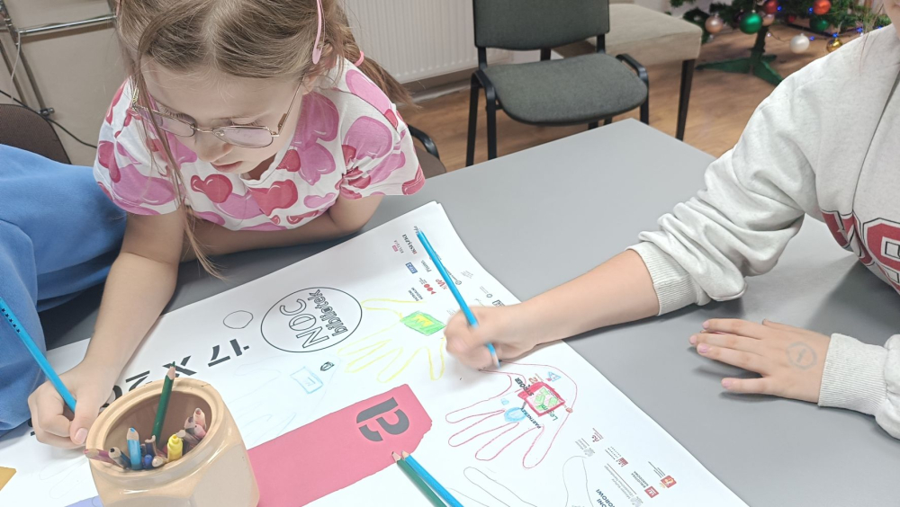 Po obejrzeniu filmu uczniowie wspólnie wykonali plakat, na którym odrysowali swoje dłonie i zostawili odciski palców oraz umieścili miniaturki przedmiotów związanych z pracą detektywów.