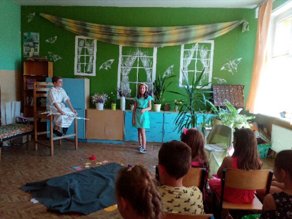 Dnia 12.06. 2019r. klasa 5a zaprosiła do krainy mitów klasę 4a. Uczniowie przygotowali przedstawienie inspirowane mitologiczną historią o Demeter i Korze. Młodzi artyści wykonali wspaniałe stroje, charakteryzujące grane przez nich postacie. Wszyscy z zaangażowaniem odegrali przydzielone im role. Udział w spektaklu teatralnym dostarczył uczniom wiele radości i satysfakcji.