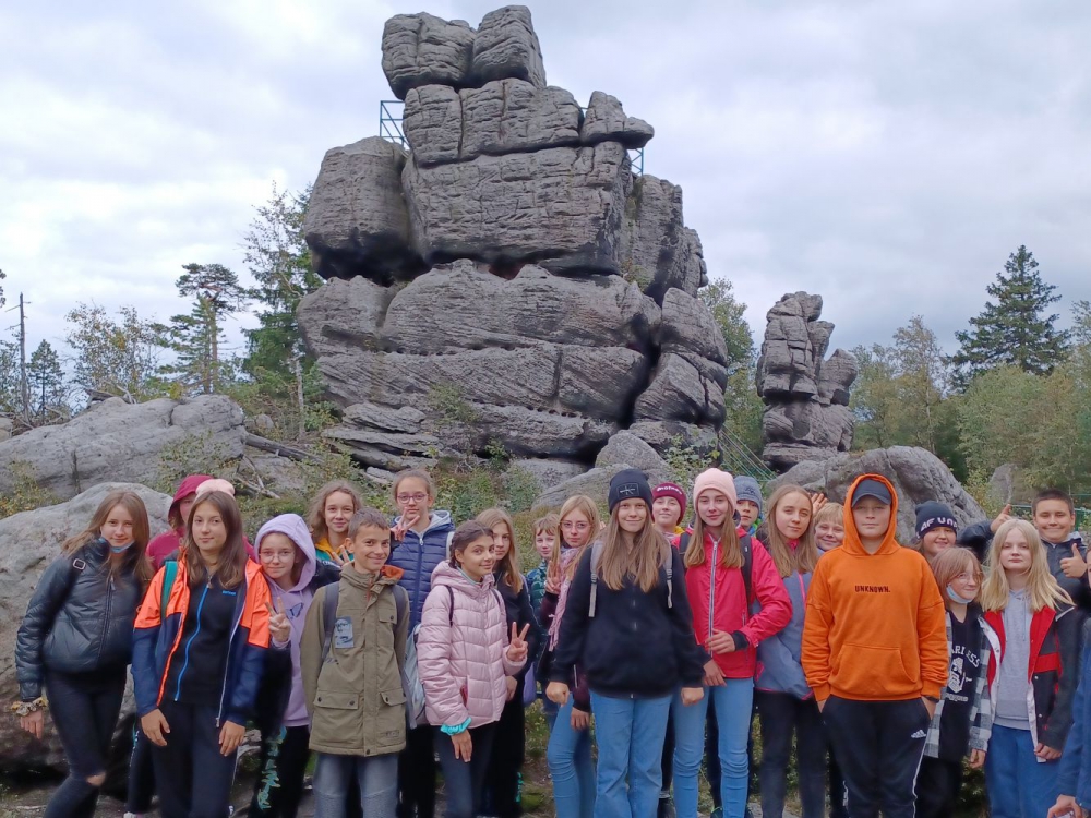 W dniach 21-22 września 2021 roku zorganizowaliśmy jako wychowawcy wycieczkę dla klasy 6a oraz 7a. Uczniowie w pierwszym dniu spędzili czas aktywnie na raftingu (spływ pontonowy) przełomem bardzkim na rzece Nysa Kłodzka. Następnie zatrzymaliśmy się w Kłodzku na posiłek. Dalej ruszyliśmy w kierunku miejscowości Karłów, aby zdobyć Szczeliniec Wielki oraz przejść malowniczą trasę turystyczną na szczycie m.in. "piekiełko" czy "diabelską kuchnię". Dzieci na dole na tzw. "Krupówkach" kupiły pamiątki i ruszyliśmy do punktu noclegowego w Zieleńcu. Po zakwaterowaniu w hotelu "Zieleniec" czekała na nas obiadokolacja. Następnie dzieci miały czas dla siebie na odpoczynek i regenerację.