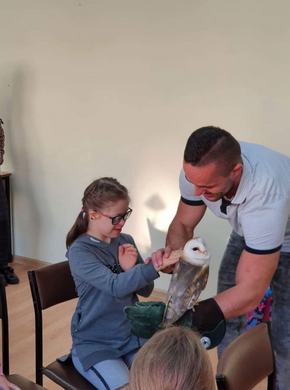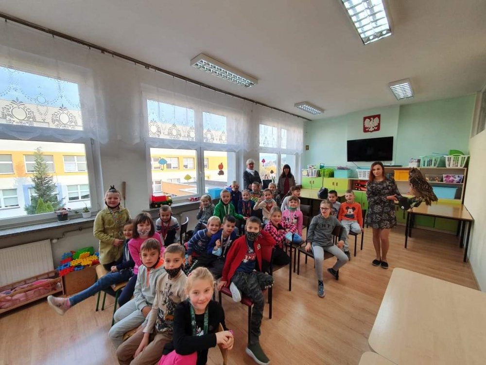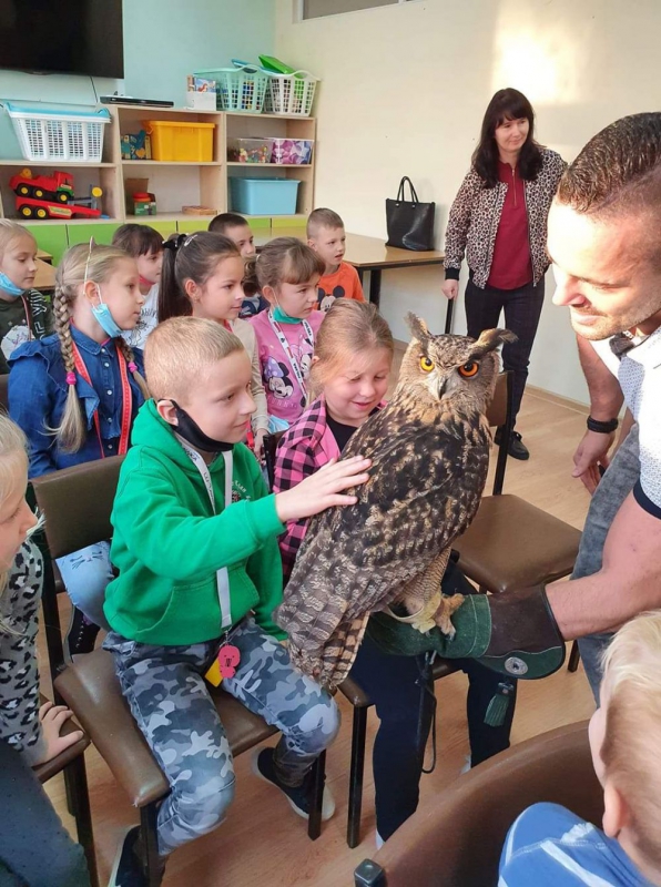 Dnia 26.10.2021 r. do naszej szkoły przybył niezwykły gość, Pan Kuba wraz ze swoimi trzema sowami, mieszkankami "Skrzydlatej Ferajny". Podczad godzinnej lekcji przyrody, uczniowie klas 1 a i b zdobyli mnóstwo cennych informacji o życiu tych pięknych ptaków. Atrakcją dla dzieci była możliwość pogłaskania sów, co sprawiło im ogromną radość.