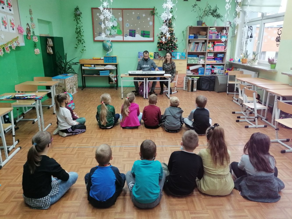 Tuż przed świętami uczniowie klas pierwszych zostali wprowadzeni w świąteczny klimat przy melodiach znanych kolęd zagranych przez naszego gościa, Pana Emila Zająca na keyboardzie i akordeonie. Oprócz śpiewu, dzieci miały możliwość obejrzeć z bliska instrumenty a także zagrać kilka taktów.