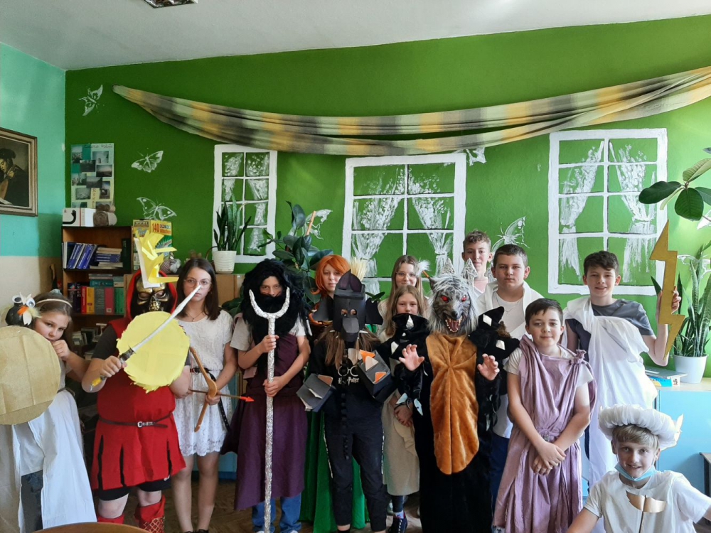Dnia 09.03.2022r. klasa 5b zabrała w podróż do krainy mitów klasę 4a. Uczniowie zaprezentowali się jako bogowie greccy i opowiedzieli o dziedzinie, którą się opiekują. Każdy bóg był przedstawiony z charakterystycznym dla niego przedmiotem, nazywanym atrybutem.