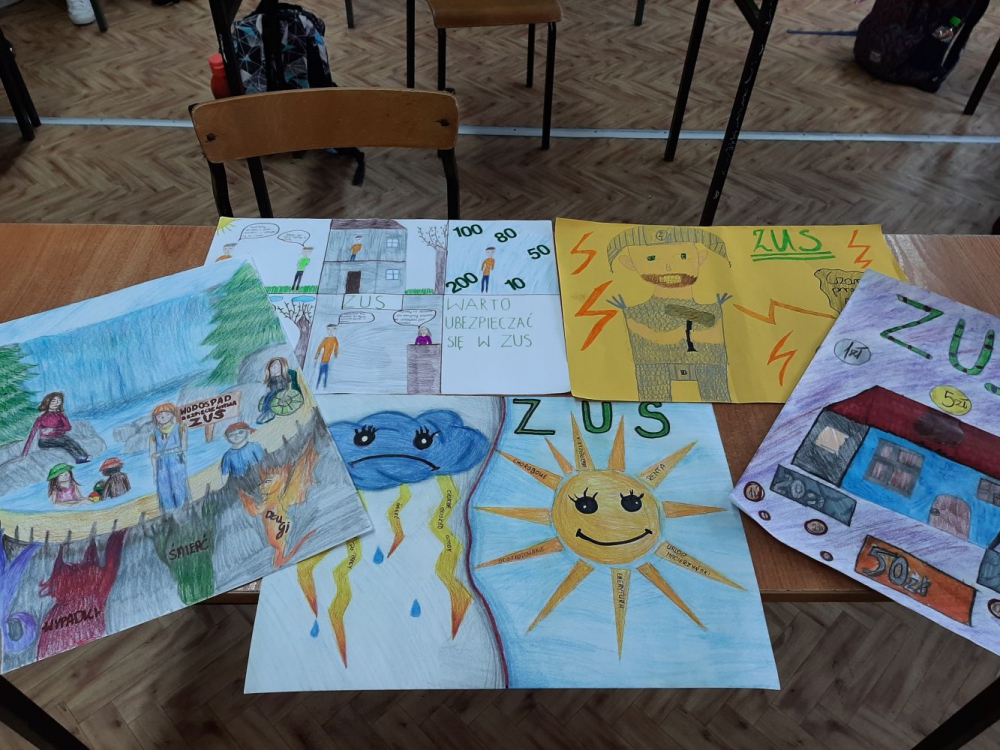 Od września jest realizowany w naszej szkole ogólnopolski projekt edukacyjny ZUS "Dlaczego ubezpieczenia społeczne są ważne?". Celem projektu jest budowanie świadomości młodego pokolenia o tym, jak istotne są ubezpieczenia społeczne. W ramach programu uczniowie klasy 8a przygotowali na lekcji wos-u plakaty oraz komiksy. Prace uczniów zostały wysłane do Legnicy i wezmą udział w ogólnopolskim konkursie.