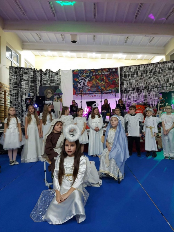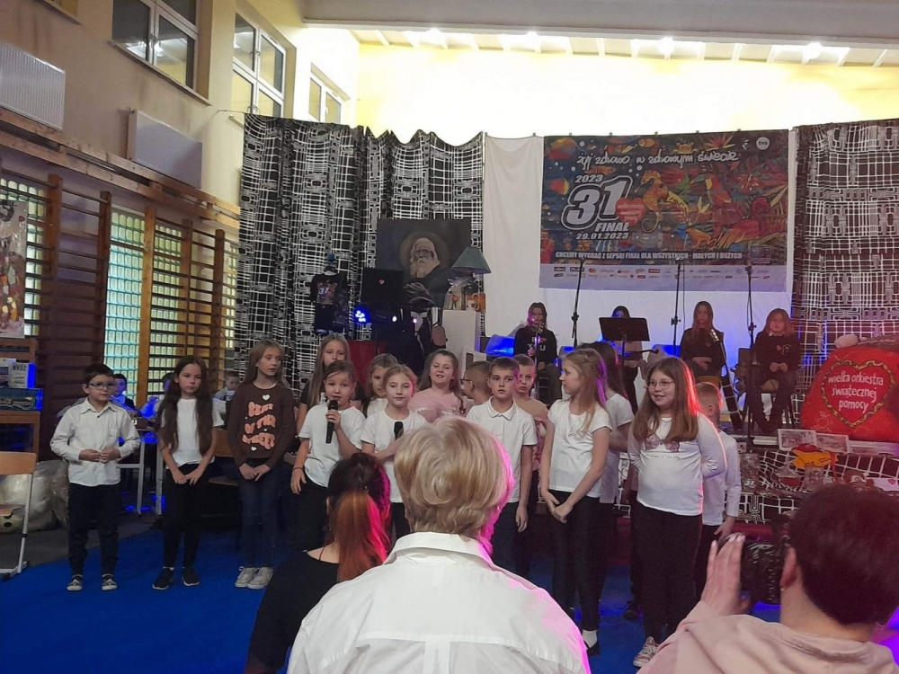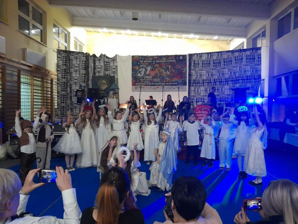 Uczniowie klas 2a i 2b również wsparli akcję WOŚP. Publiczność mogła zobaczyć młodych artystów w świątecznym przedstawieniu oraz posłuchać pięknej piosenki o pomaganiu. Po występie licytowano dary od obu klas. Gratulujemy dzieciom i rodzicom za ogromne serca i zaangażowanie!