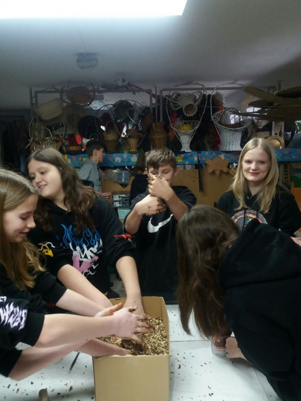 Uczniowie przygotowali wiszące tubki i płytki z pokarmem i tłuszczami, które w czasie mrozów pomagają ptakom przetrwać.