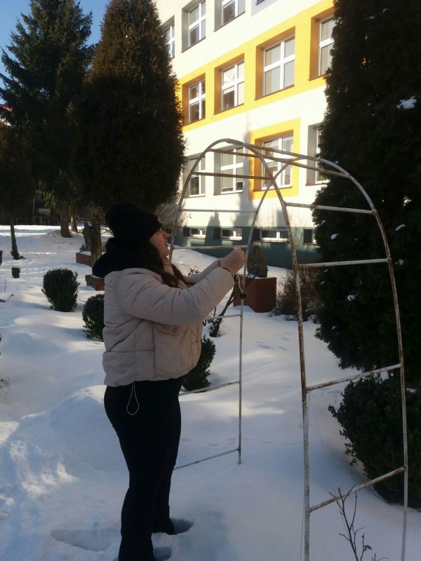 7 lutego 2023 klasa 7a podczas godziny wychowawczej przygotowała przysmaki dla ptaków i rozwiesiła je wokół szkoły. Każdy z uczniów przyniósł z domu coś smakowitego i odpowiedniego dla ptaków podczas srogiej zimy