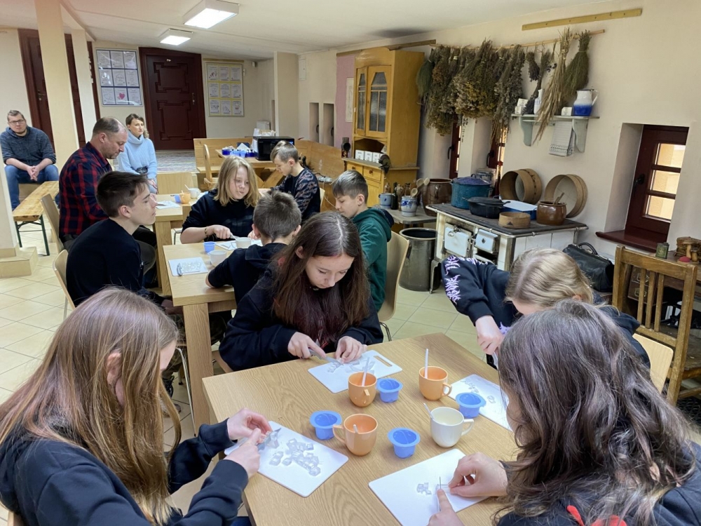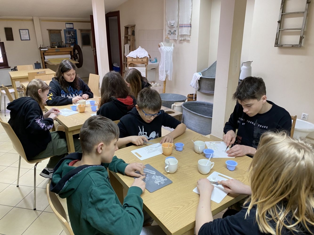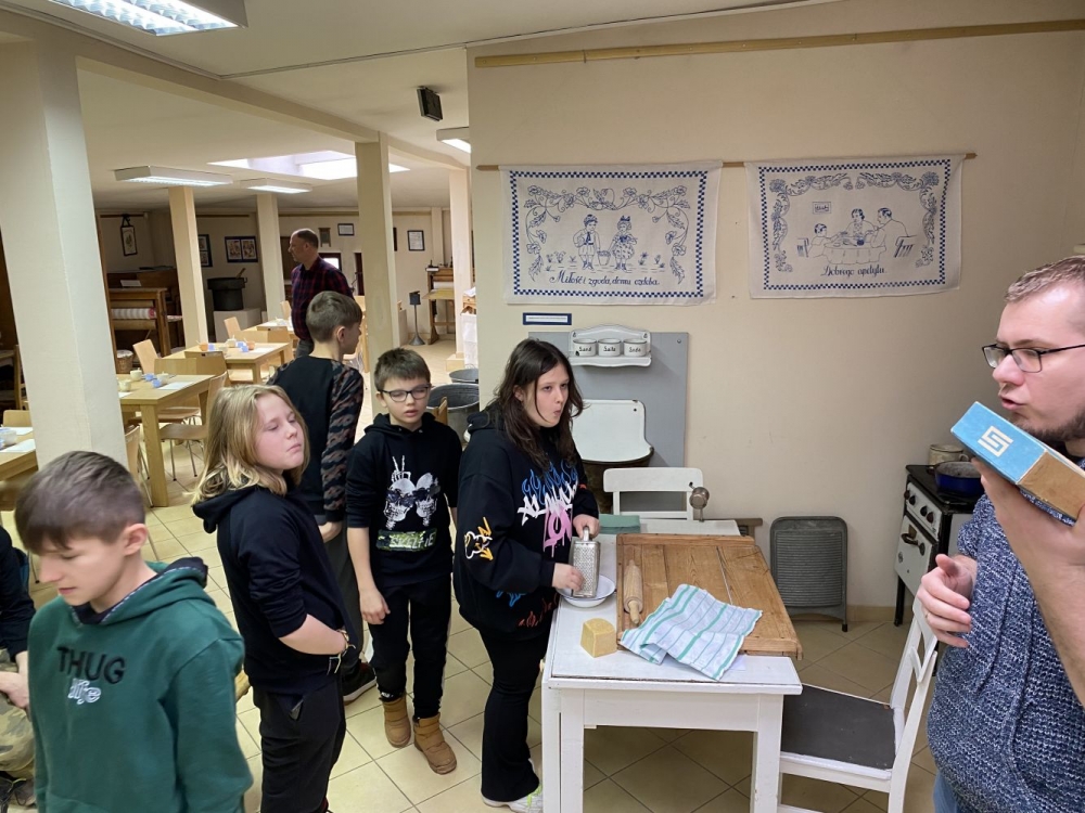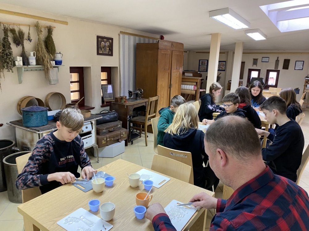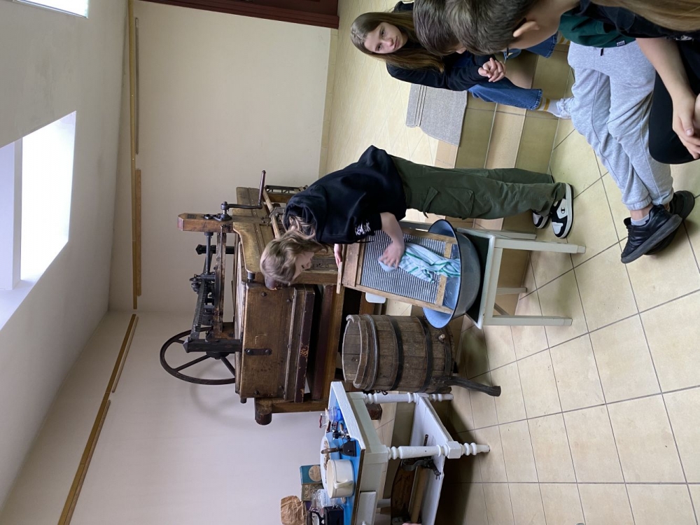 Dnia 21.03.2023 klasa 7a wzięła udział w wyjeździe edukacyjnym do Muzeum Tkactwa w Kamiennej Górze. W trakcie wizyty uczniowie aktywnie uczestniczyli w lekcji muzealnej dotyczącej tematu: "Pranie, prasowanie i higiena dawniej". Dzieci oglądały eksponaty związane z w/w tematem oraz wzięły udział w warsztatach polegających na wykonaniu mydła.