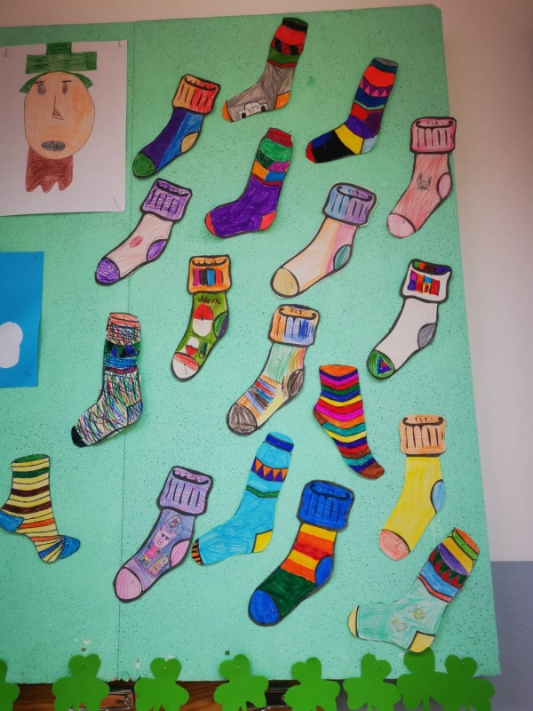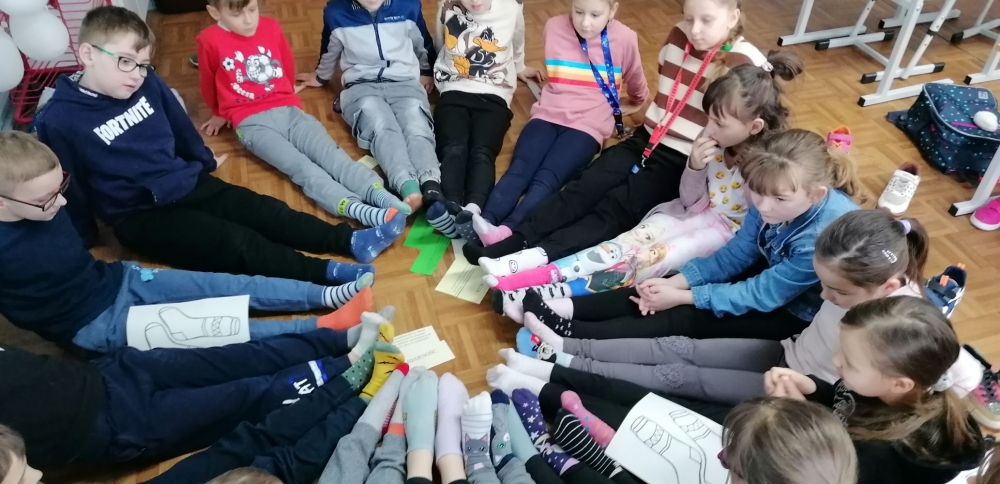 W związku z przypadającym 21 marca Światowym Dniem Osób z Zespołem Downa przeprowadzono zajęcia dla uczniów klasy 2a i 2b dotyczące wiedzy o trisomii 21. Na podstawie prezentacji oraz filmu, dzieci dowiedziały się czym charakteryzują się osoby z ZD i jak należy je traktować w życiu codziennym. Uczniowie wspólnie odnajdowali znaczenia takich słów jak integracja, akceptacja, różnorodność i integracja. Na koniec dzieci pokolorowały sylwetę skarpety nie do pary będącej symbolem tego dnia. W klasach 1-3 wszyscy uczniowie dołączyli się do skarpetkowego wyzwania przychodząc w dwóch różnych i kolorowych skarpetkach. Tego dnia Ola, nasza uczenica z ZD była bardzo szczęśliwa i uśmiechnięta a my razem z nią.