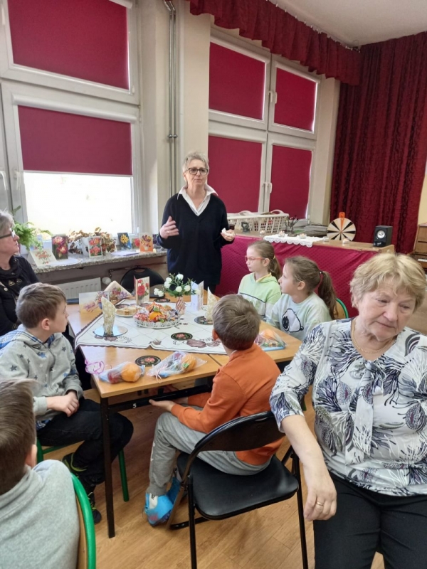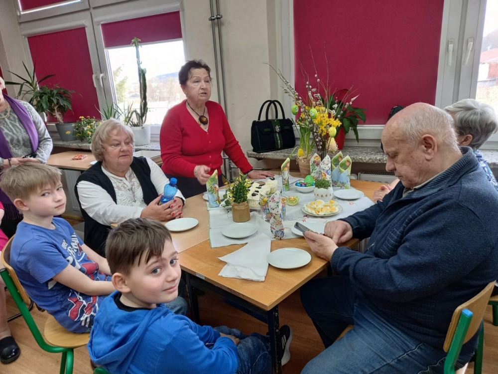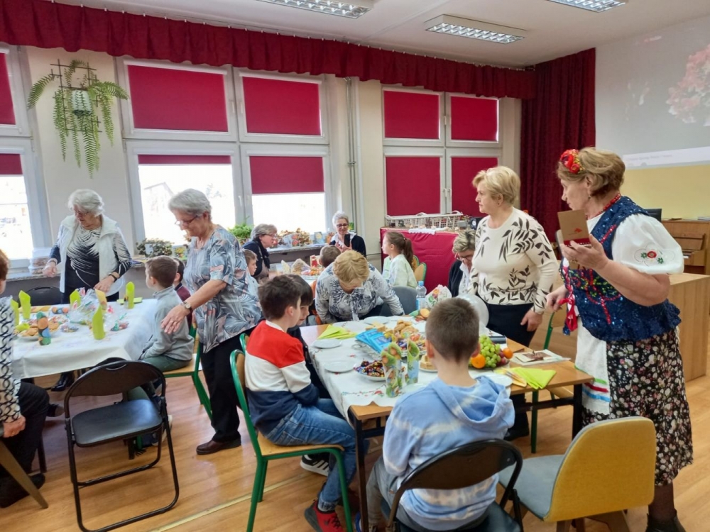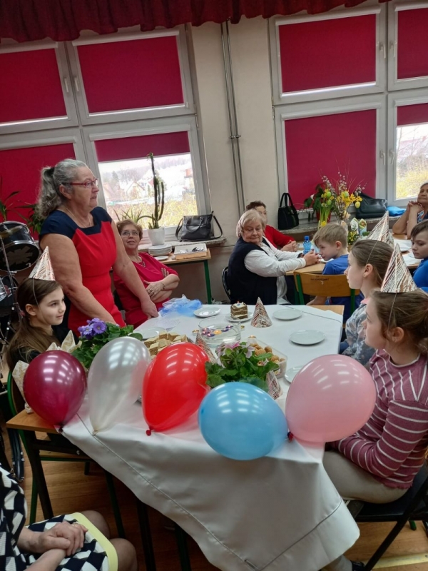28 marca 2023 r. był dla dzieci z klasy 3a Szkoły Podstawowej w Chełmsku Śląskim dniem szczególnym. Słuchaczki i słuchacze UTW w Kamiennej Górze odwiedzili dzieci z niespodzianką. W jednej z sal przygotowano pięknie udekorowane stoliki na których zawitały owoce, ciasta, desery, lody oraz ozdoby i kartki okolicznościowe. Uczniowie wysłuchali dawnych i współczesnych zwyczajów towarzyszących podczas różnych uroczystości rodzinnych. Pojawiły się stoliki tematyczne dotyczące: imienin, urodzin, Wielkanocy, Dnia Babci i Dziadka, Dnia Dziecka. Podczas wspólnej biesiady pokoleń nie zabrakło sto lat dla jednej z pań oraz życzeń dla dzieci, nauczycieli i studentów UTW w Kamiennej Górze. Trzecioklasiści z Chełmska Śląskiego mieli po raz pierwszy okazję do udziału w tak pięknie przygotowanej lekcji innej niż zwykle. Pierwsze odruchy zdziwienia i niedowierzania zamieniły się w radość i wspólną zabawę. Na ręce pani Apolonii Lulek - pełnomocnik rektora ds. Karkonoskiego Uniwersytetu Trzeciego Wieku przy Karkonoskiej Akademii Nauk Stosowanych w Jeleniej Górze dzieci złożyły kwiaty i wielkie podziękowania za wizytę , moc wrażeń oraz poświęcony czas i zaangażowanie. Zwieńczeniem wizyty słuchaczy UTW w Kamiennej Górze w chełmskiej placówce było zwiedzanie ekomuzeum szkoły i Chełmska Śląskiego.