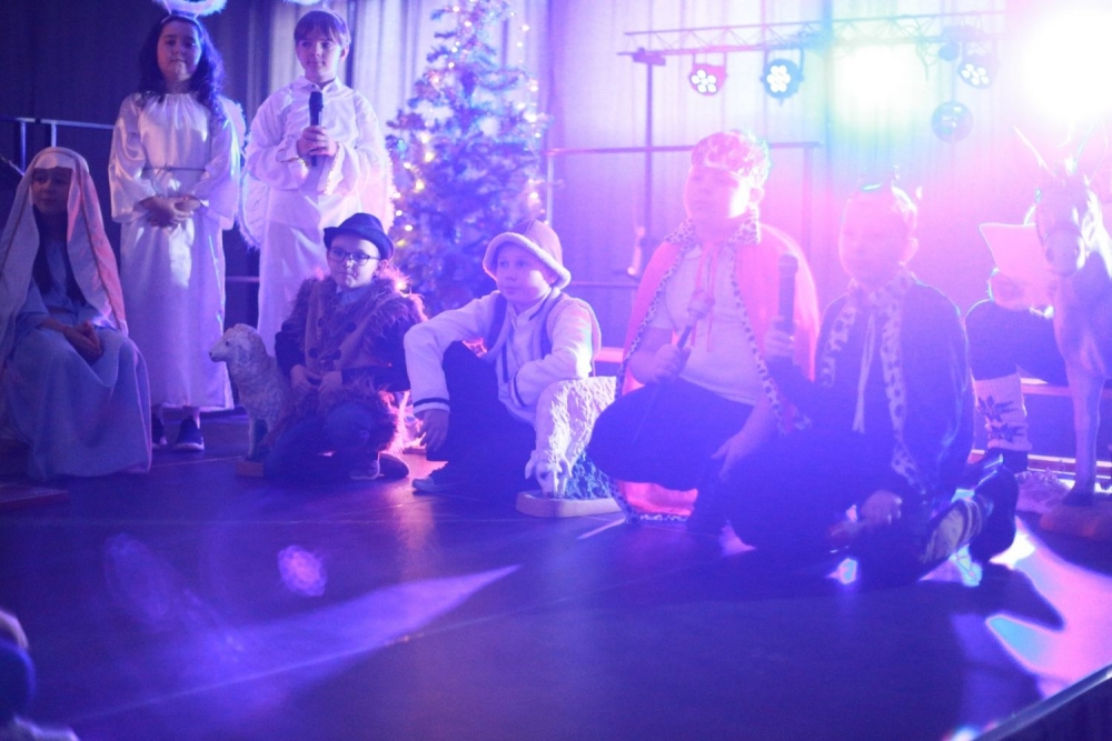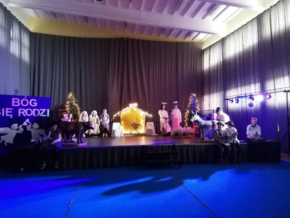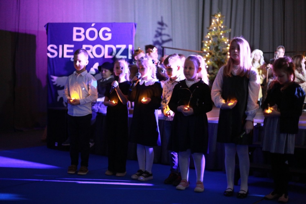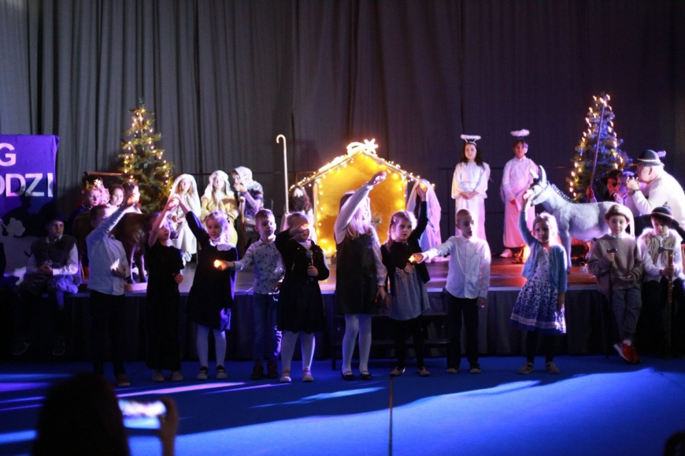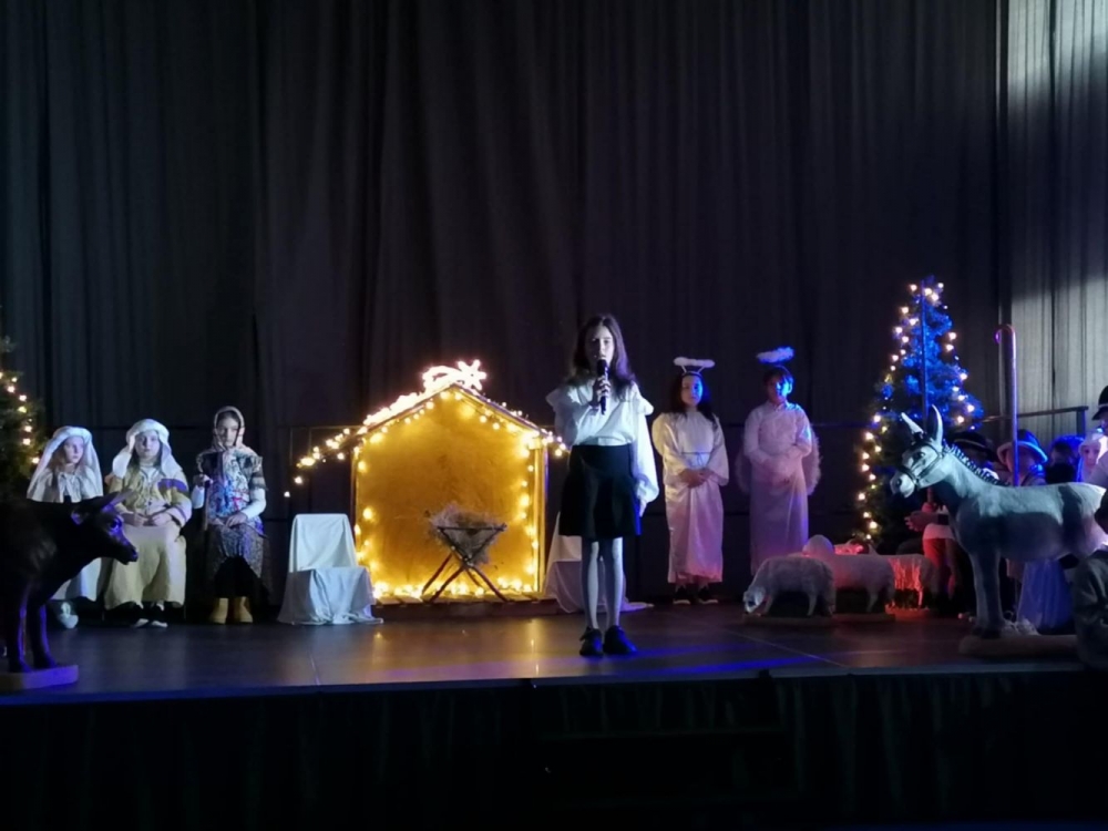 Jasełka w wykonaniu dzieci wprowadziły wszystkich w świąteczny nastrój. Piękny śpiew kolęd i pastorałek uświadomił wszystkim, że Święta Bożego Narodzenia są już bardzo blisko. Dzieci podzieliły się opłatkiem z publicznością. Klasa 1b śpiewem złożyła społeczności szkolnej najlepsze życzenia świąteczne.