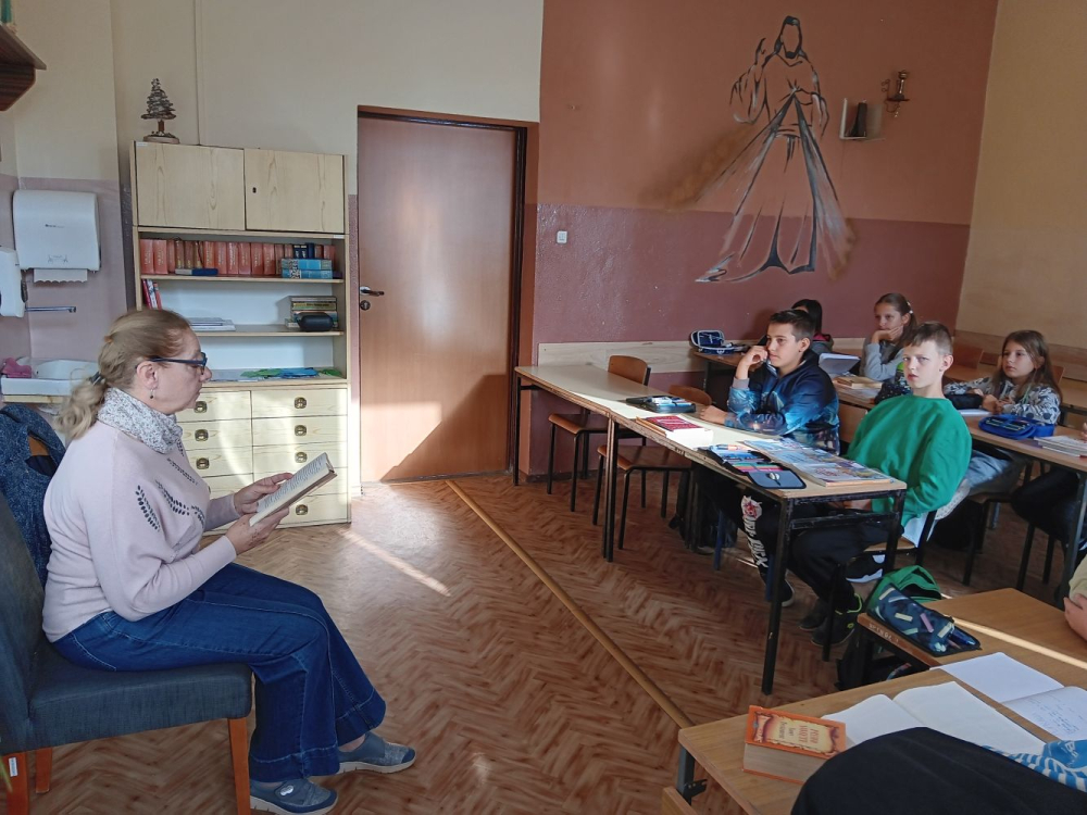 Oprócz konkursu, na wtorkową lekcję języka polskiego, dnia 30.09.2025r., została zaproszona pani bibliotekarka Beata Nawrocka. Klasa Vb z uwagą słuchała fragmentu lektury obowiązkowej Chłopcy z Placu Broni oraz przeniosła się w niezwykły świat bohaterów literackich. Na podsumowanie lekcji pani B. Nawrocka powiedziała dzieciom, że czytanie na głos to nie tylko tradycja, ale także doskonały sposób na rozbudzanie pasji do książek.