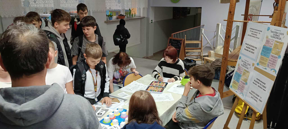 Od samego rana w Zespole Szkolno-Przedszkolnym w Chełmsku Śląskim promowaliśmy troskę o zdrowie psychiczne poprzez różnorodne działania. Przy wejściu do szkoły oraz w holu czekały na uczniów ankiety, które zachęcały do zastanowienia się nad własnym nastrojem i sposobami dbania o siebie. Nie zabrakło również kolorowanek antystresowych, gier, ulotek informacyjnych oraz słodkiego akcentu cukierków, rozdawanych pod wspólnym hasłem Dzień Zdrowia Psychicznego.
