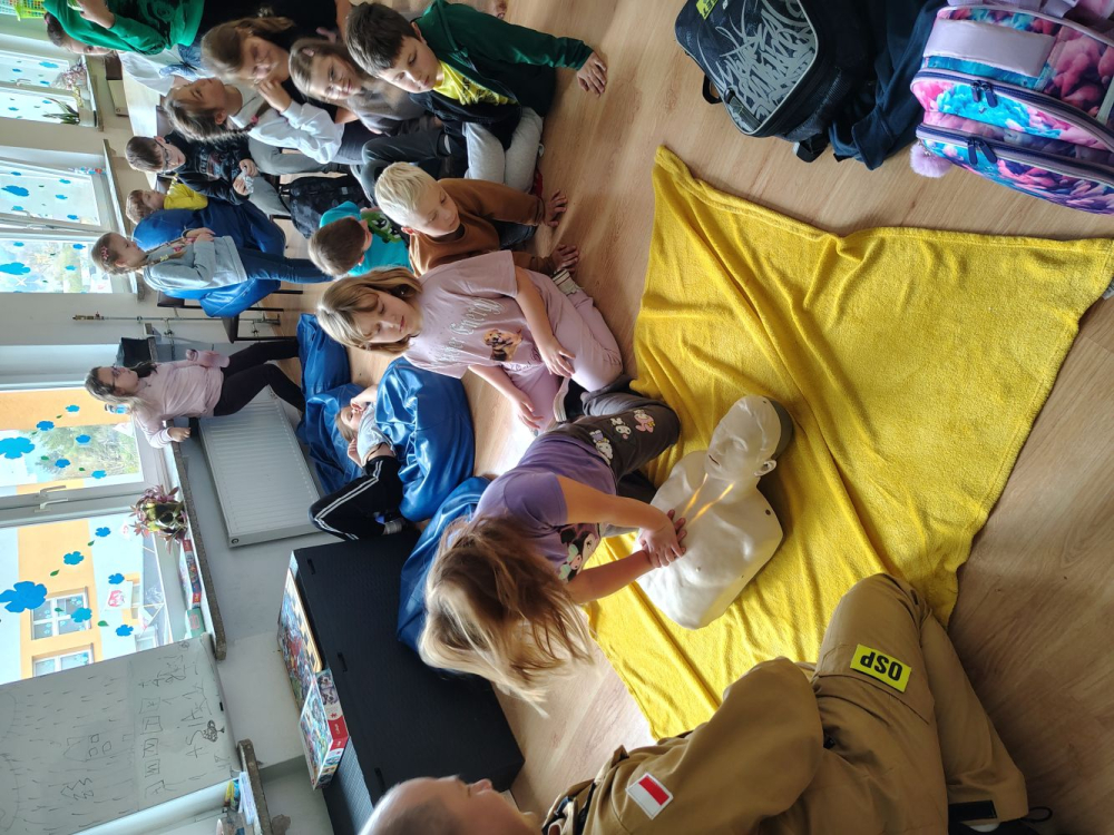 22 października 2025 r. w świetlicy szkolnej odbyło się dla dzieci z klas 1-3 szkolenie z pierwszej pomocy przedmedycznej. Zajęcia przeprowadził naczelnik OSP w Chełmsku Śląskim Paweł Gregorczyk wraz z druhem Danielem Borysem. Dzieci zapoznały się z zasadami udzielania pierwszej pomocy oraz przećwiczyły technikę uciśnięć klatki piersiowej i układania poszkodowanego w pozycji bocznej ustalonej. Dzieci chętnie brały udział w zajęciach i poszerzyły swoją wiedzę w tym temacie.