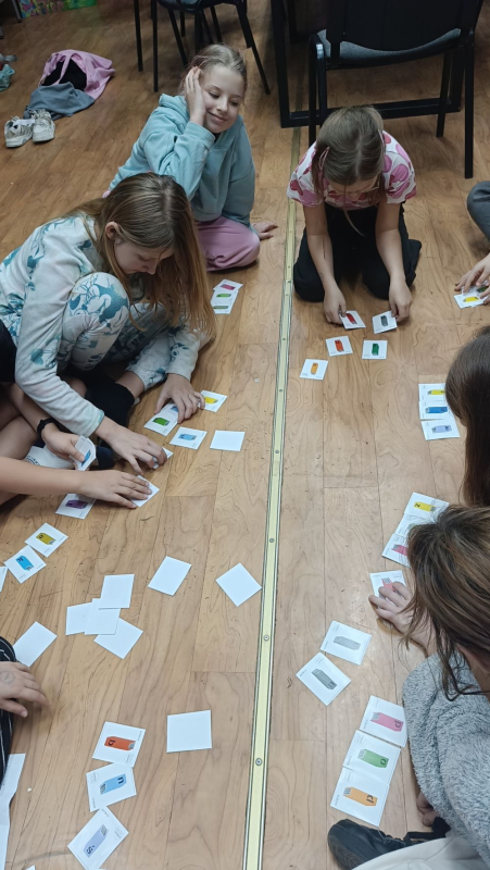 Po obejrzeniu filmu uczniowie wspólnie wykonali plakat, na którym odrysowali swoje dłonie i zostawili odciski palców oraz umieścili miniaturki przedmiotów związanych z pracą detektywów.