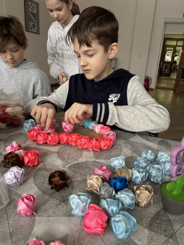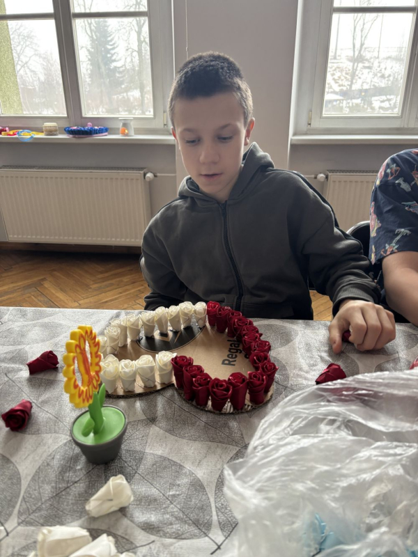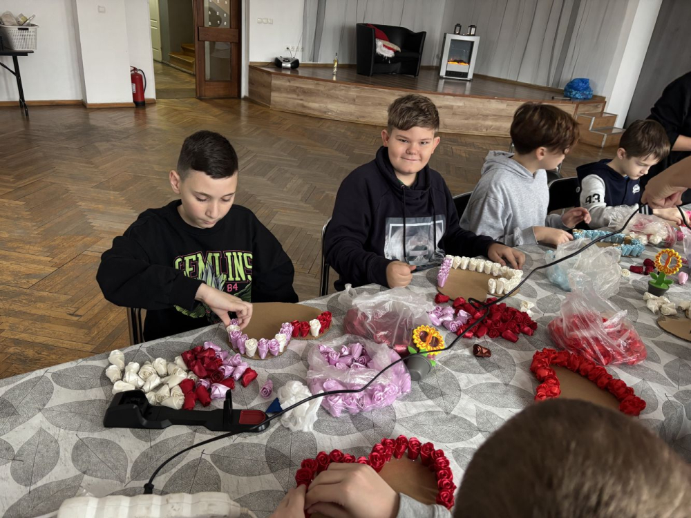 Podczas warsztatów uczniowie wykonywali własnoręczne upominki, wykorzystując przepiękne małe różyczki przygotowane przez Panie z domu kultury. Zajęcia przebiegały w miłej atmosferze, sprzyjającej współpracy i integracji zespołu klasowego. Uczniowie z dużym zaangażowaniem i radością tworzyli prezenty, które z pewnością sprawią wiele wzruszeń obdarowanym babciom i dziadkom.