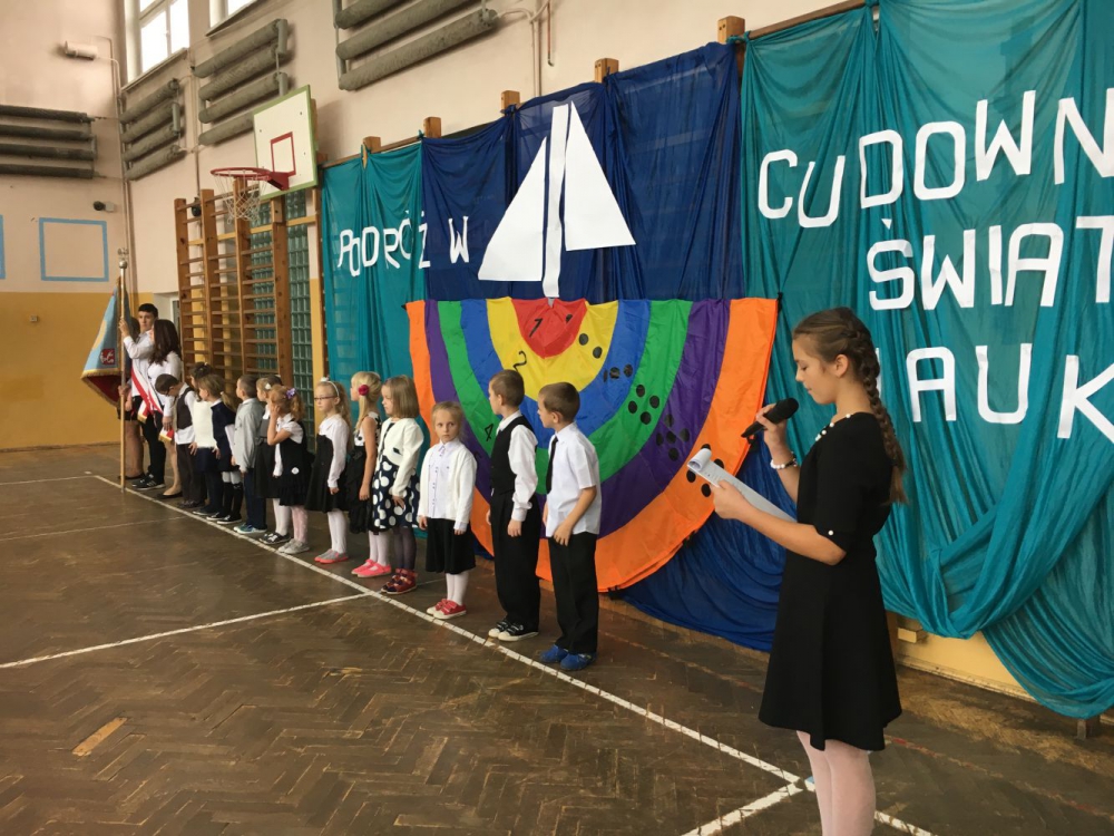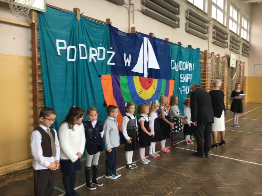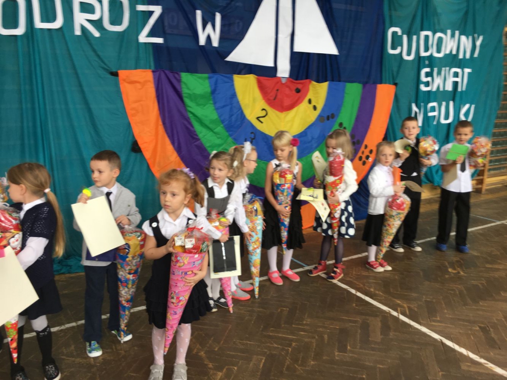 Uczniowie klasy pierwszej zaprezentowali się w programie artystycznym przed wszystkimi zaproszonymi gośćmi. Uroczystego aktu pasowania dokonał pan dyrektor Waldemar Szwalec z panią Bożeną Zacharą. Uczniowie otrzymali upominki od grup przedszkolnych oraz od uczniów klas drugich, otrzymali również odblaski, które poprawią ich bezpieczeństwo na drodze. Pamiątkowe dyplomy oraz tuby ze słodyczami i niespodzianką od rodziców. Po uroczystości wszyscy udali się na słodki poczęstunek do klasy.