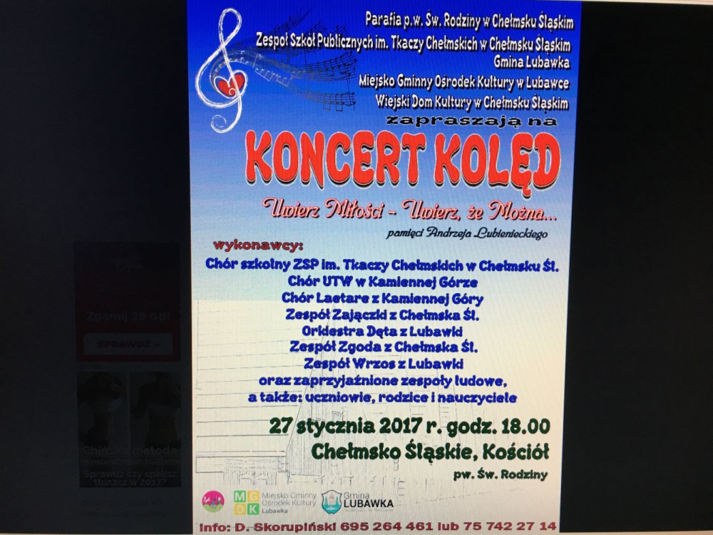 Koncert kolęd. 27 stycznia 2017 w Kościele p.w.Św. Rodziny w Chełmsku Śląskim - zapraszamy. Galeria zdjęć Anna Głuchowska Szkoła Podstawowa Data wydarzenia: 2017-01-09 Stworzony: 2017-01-09 08:14 Edytowany: 2017-01-10 10:22