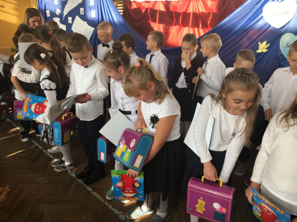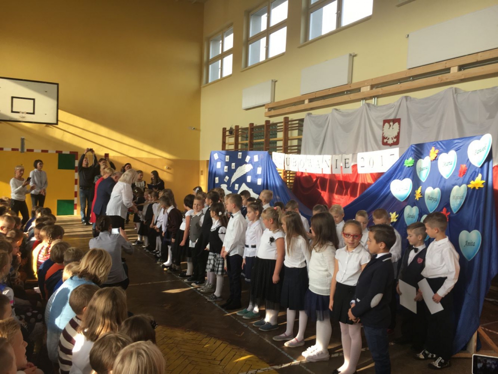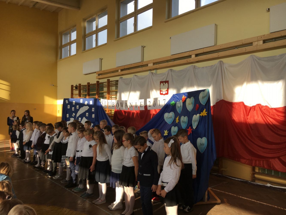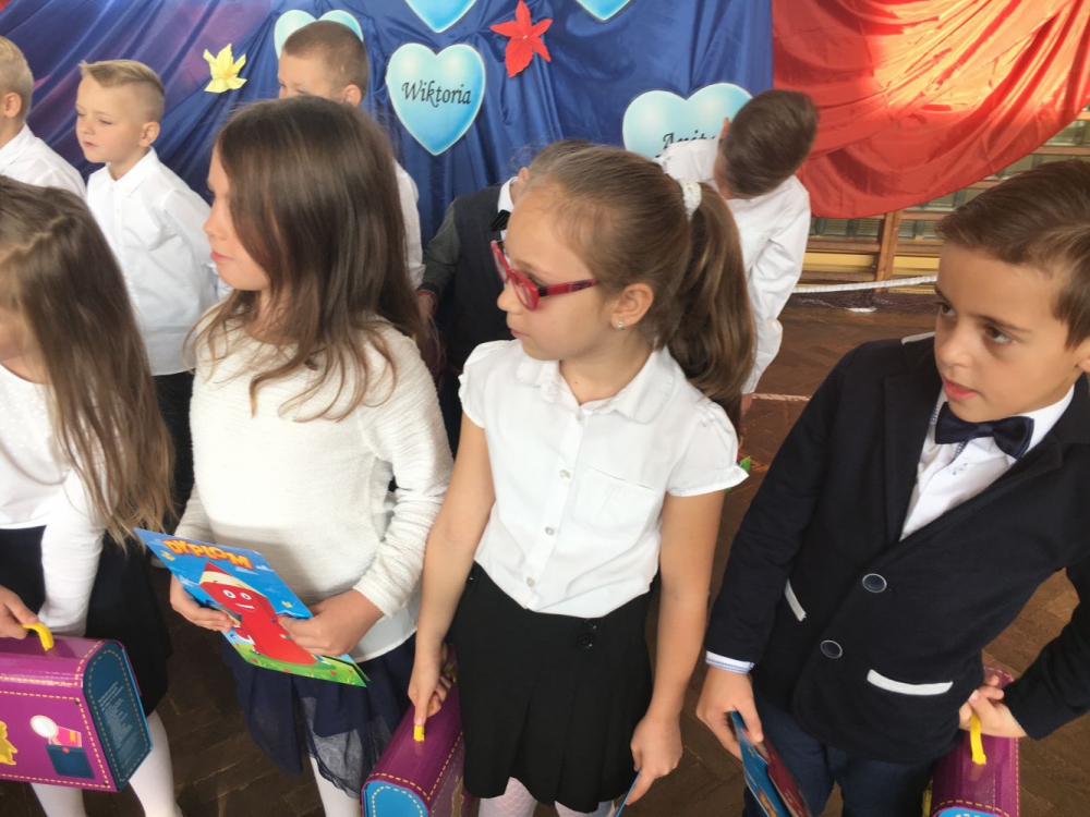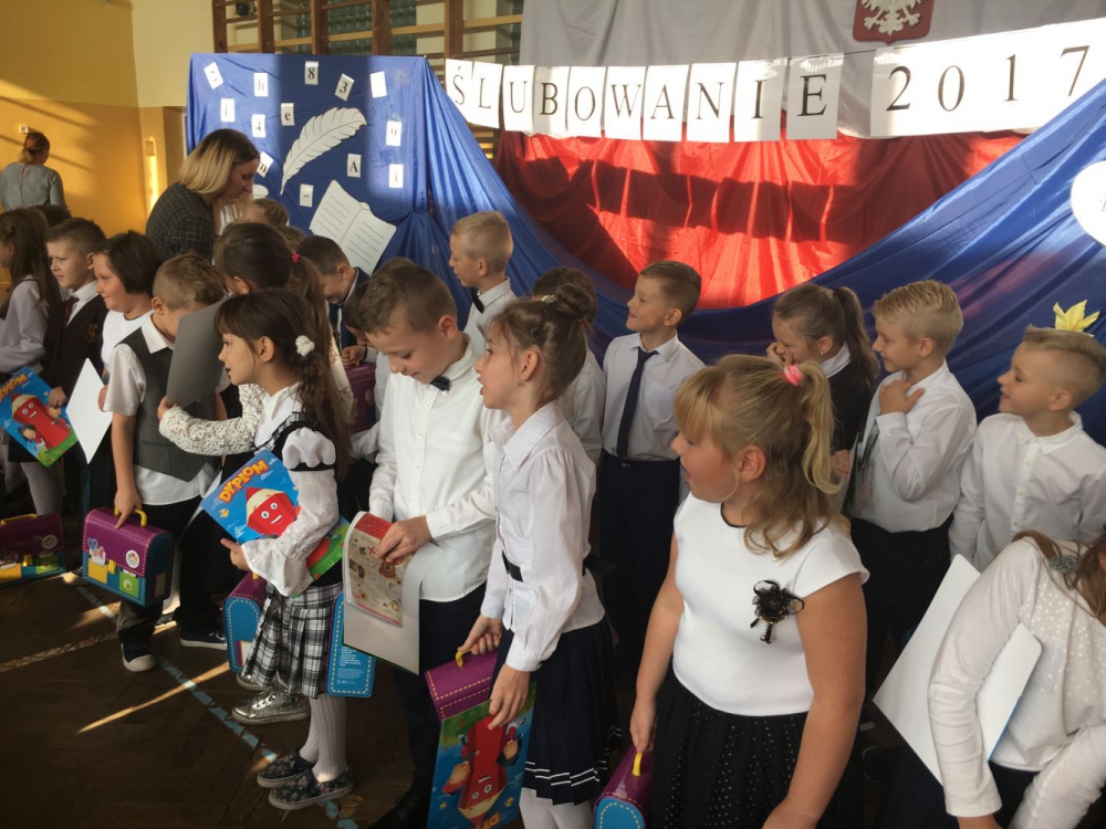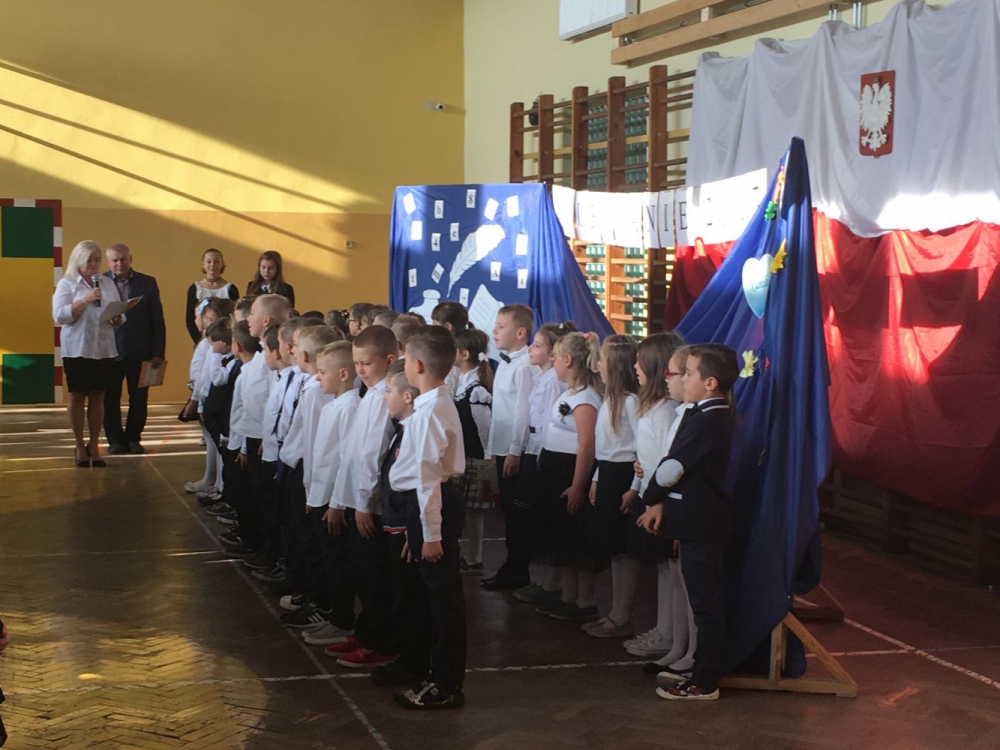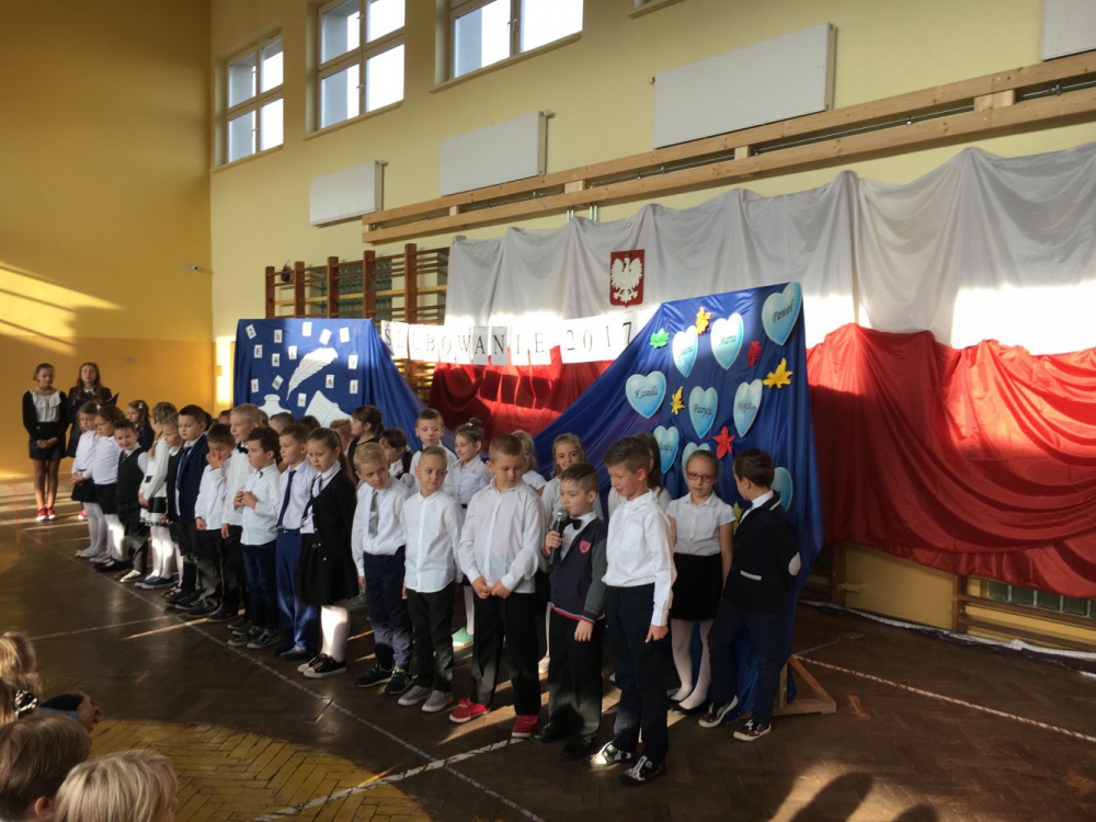 Pierwszoklasiści w obecności Dyrekcji Szkoły, pani Burmistrz, zaproszonych gości i rodziców zaprezentowali krótki program artystyczny, w którym zdali pierwszy egzamin na ucznia. Prezentowali krótkie wiersze dotyczące naszej ojczyzny, szkolnej nauki oraz zasad zachowania. Wszyscy zgodnie stwierdzili, że egzamin pięknie zdali i mogą już zostać przyjęci do braci uczniowskiej. Pierwszoklasiści ślubowali na sztandar szkoły. Następnie na prośbę Rodziców pani Dyrektor dokonała uroczystego aktu pasowania. Uczniowie otrzymali pamiątkowe dyplomy i drobne upominki, nie zabrakło również słodkiego poczęstunku.
